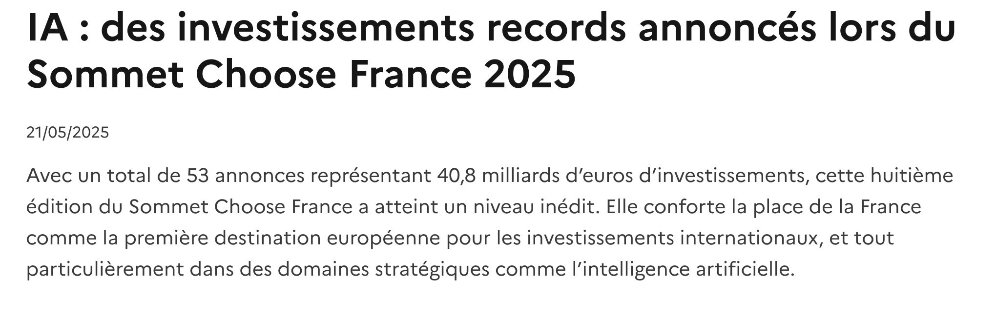 Énième temps fort d’un agenda bien précis, VivaTech aura rassemblé les grands acteurs de la Tech : à commencer par Jensen Huang (Nvidia), Young Liu, le CEO de Foxconn (la société taïwanaise qui produit les iPhones d’Apple), qui a rencontré la Ministre Clara Chappaz hier, la veille de sa rencontre avec Peng Xiao, le CEO de G42, une société IA basée aux Emirats arabes unis. Quelques mois après le Sommet sur l’IA et ChooseFrance, pour attirer les capitaux étrangers, Paris travaille d’arrache-pied et déploie les grands moyens, notamment pour supplanter son “concurrent” : Londres. Emmanuel Macron ne pouvait que remonter très vite du Sommet sur les océans à Nice pour passer les messages, et favoriser les grands business, en commençant par l’achat de composants stratégiques, aussi stratégiques que le sont les métaux ou le gaz.